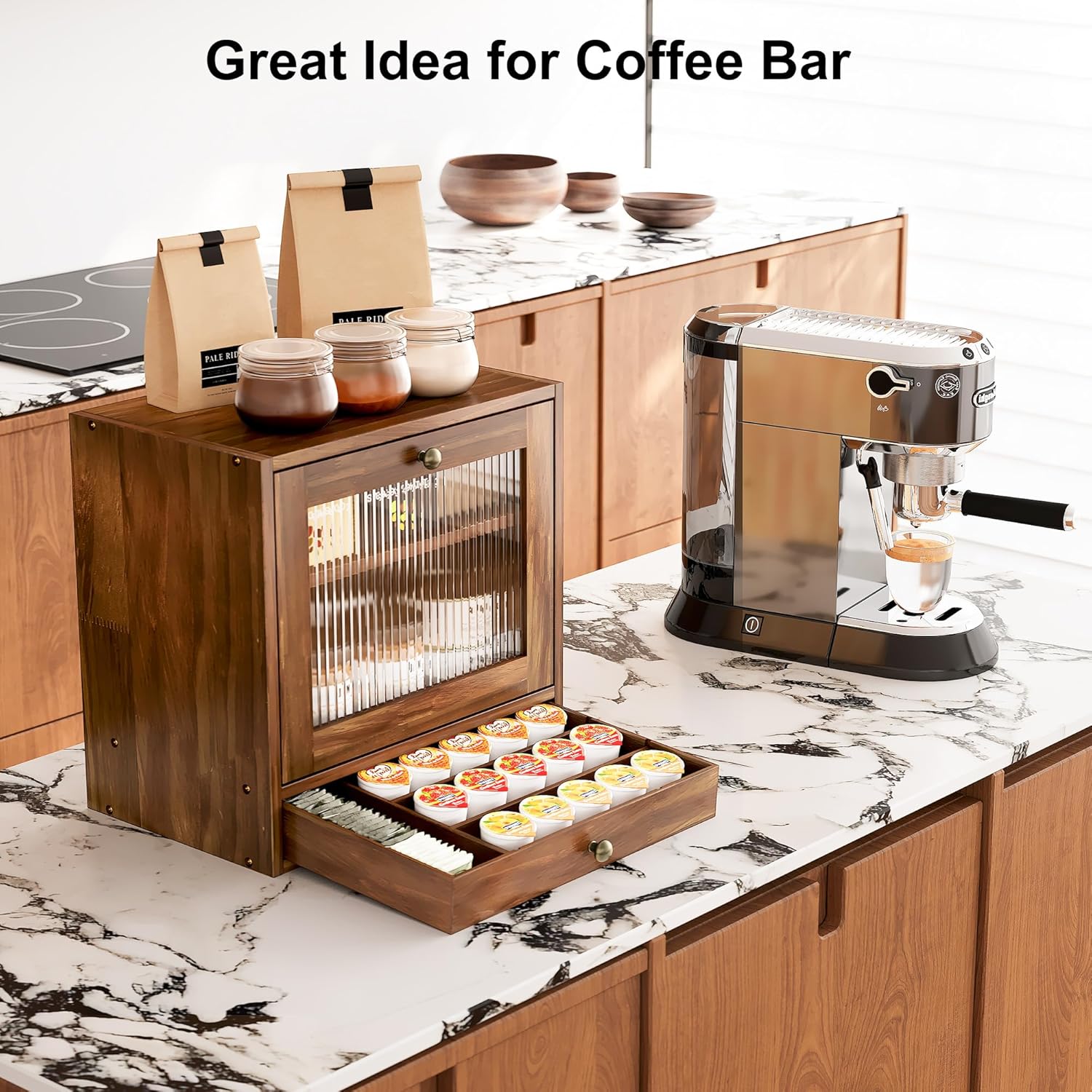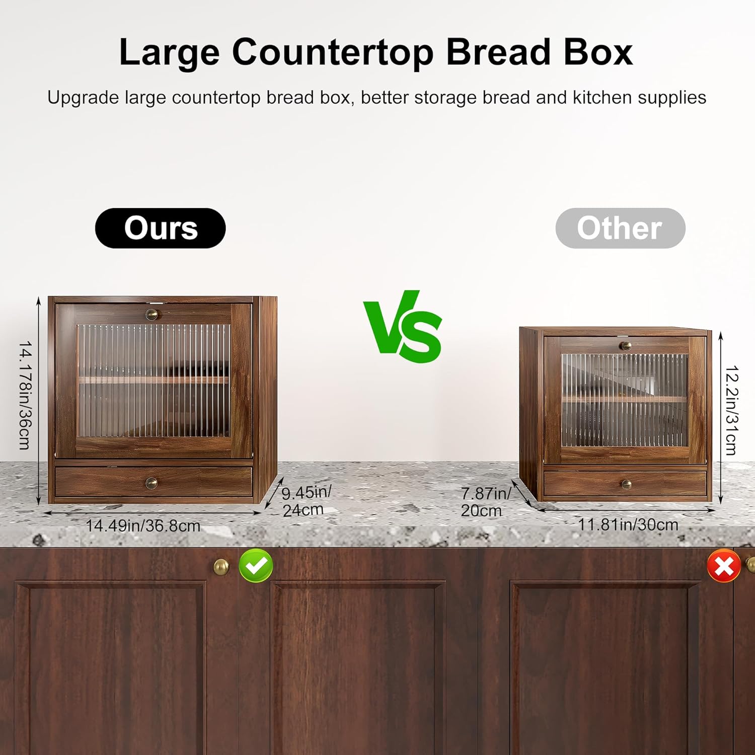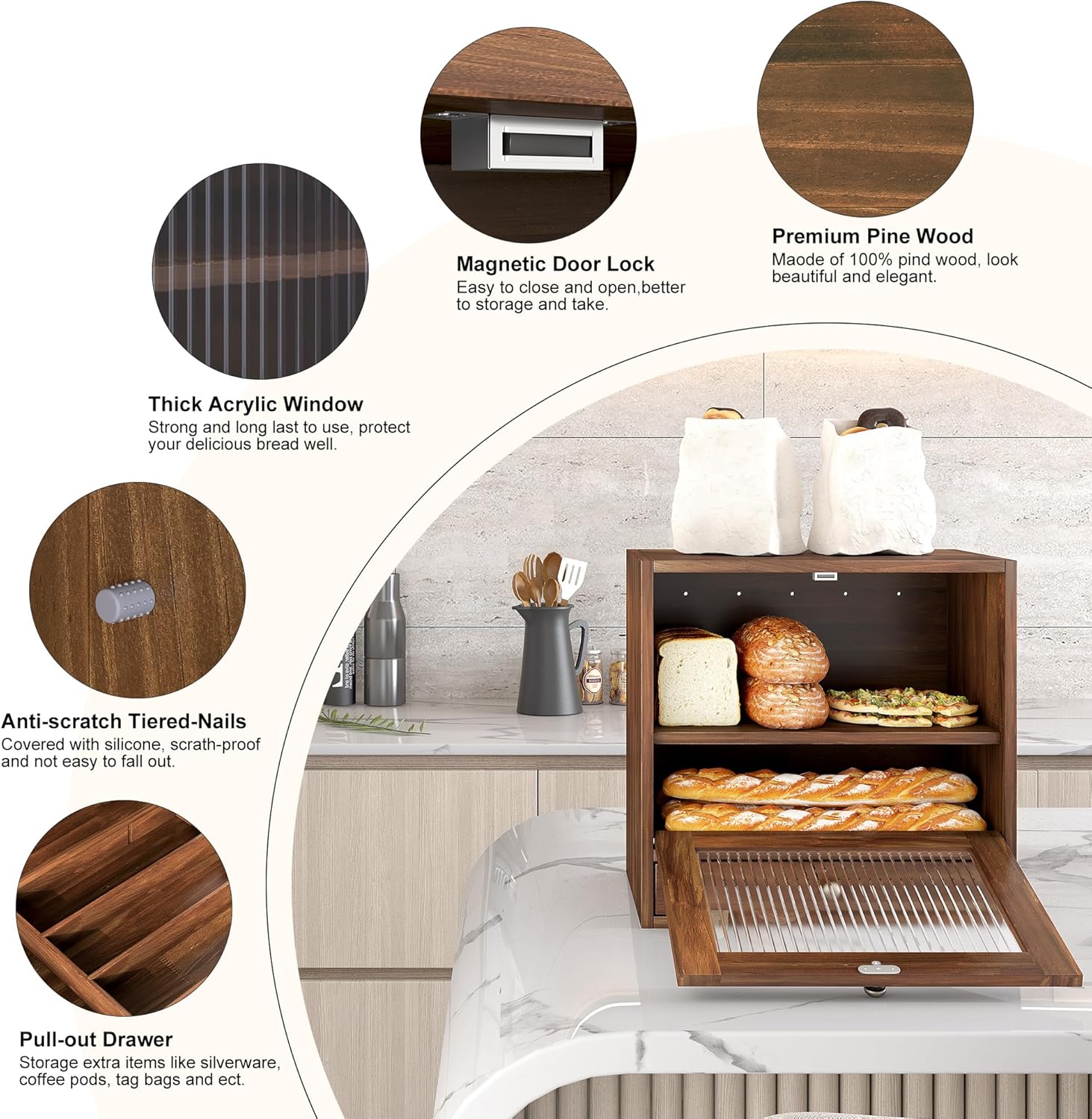 Crafted from high-quality wood in a timeless Retro Brown finish, this Breadbox Bin adds a touch of rustic elegance to any kitchen decor. The clear Acrylic Window on the front not only allows you to easily see what’s inside without opening the box but also adds a modern twist to its classic design.