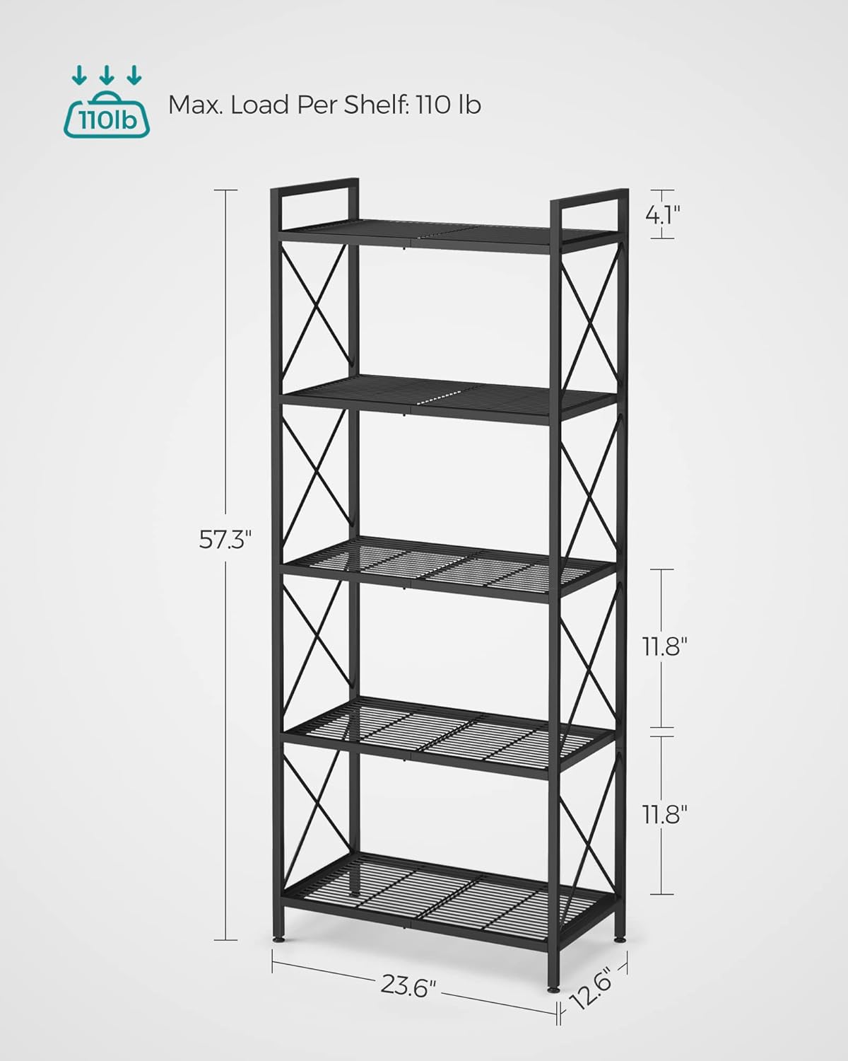 Introducing the SONGMICS 5-Tier Metal Storage Rack – the ultimate solution for your organizational needs! This versatile shelving unit features X side frames and dense mesh shelves, providing both style and functionality to any space in your home.